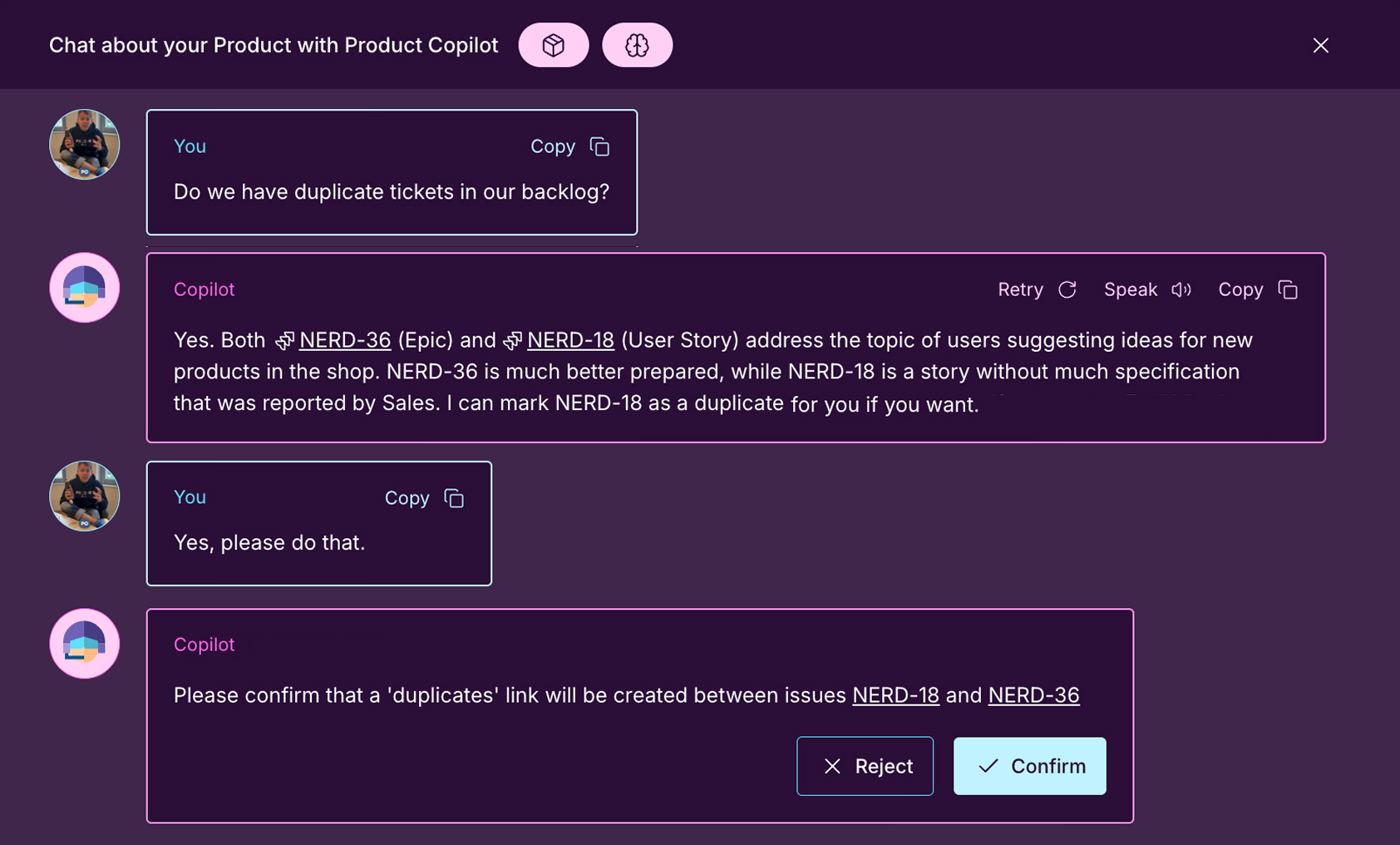 Refining your backlog is a pain? Product Copilot helps you to spot duplicates or group related tickets. You instruct it in natural language without struggling with JQL queries, search terms or weird filters.