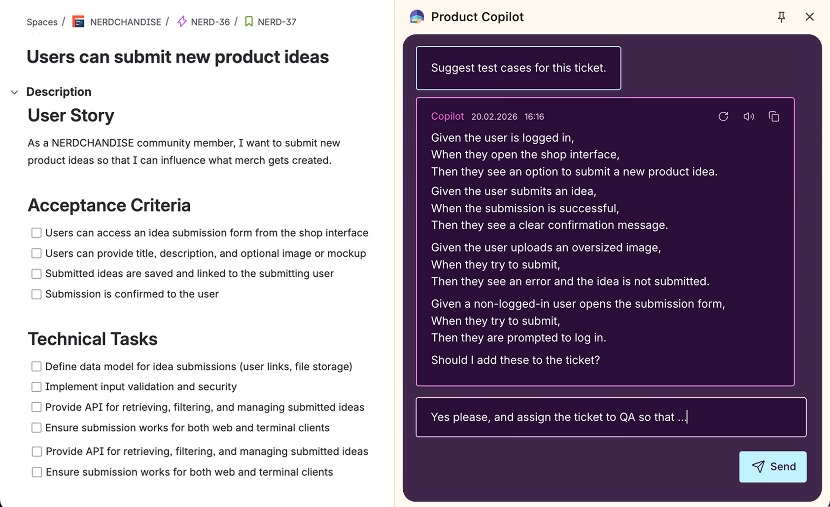 You got a clear ticket – but now it needs to be tested. Product Copilot suggests relevant test cases: Edge cases, validation rules, or things QA should double-check.