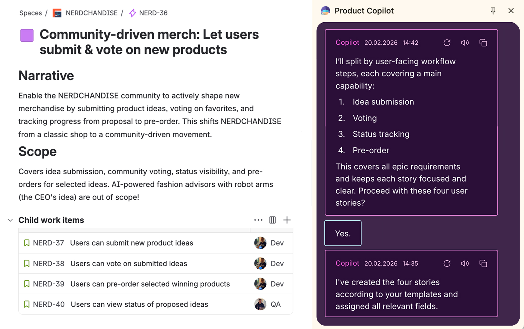 Big topic, no time? Let Copilot break it down. Product Copilot understands your epic and helps you slice it into clear, actionable user stories.